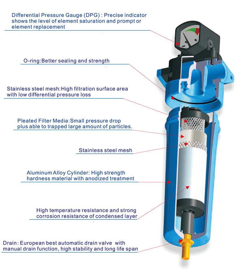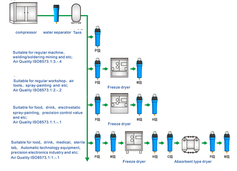 वायुमंडल में जल वाष्प, हाइड्रोकार्बन और ठोस कण (लगभग 140 मिलियन ठोस कण प्रति घन मीटर हवा) होते हैं, इन अशुद्धियों को हवा कंप्रेसर में श्वास लिया जाता है और फिर अवशिष्ट स्नेहक के साथ संपीड़ित वायु नेटवर्क में प्रवेश किया जाता है।समय पर ढंग से इन दूषित पदार्थों का इलाज करने में विफलता, इससे पाइपलाइनों का क्षरण होगा, उत्पादन उपकरण को खतरे में डालेगा, उपकरण की संवेदनशीलता और जीवन को नुकसान पहुंचाएगा, जो अंततः उत्पादों की गुणवत्ता को प्रभावित करेगा।