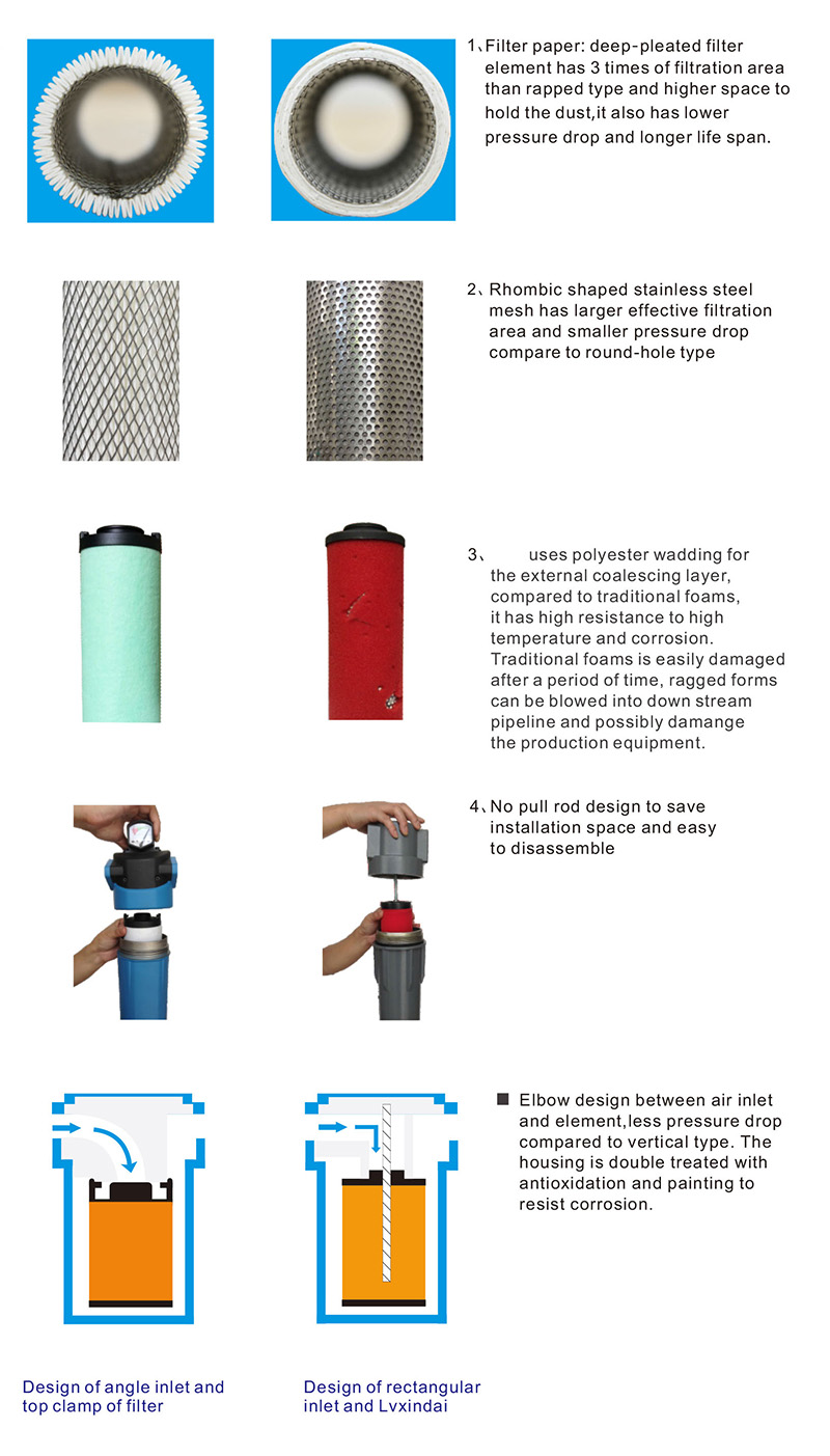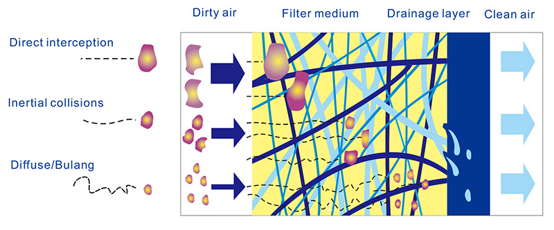 धीरे-धीरे बड़ी बूंदों में संघनित।एक बार जब वे फिल्टर मीडिया के करीब होते हैं, तो वे ग्लास फाइबर के इलेक्ट्रोस्टैटिक बल द्वारा सोख लिए जाते हैं।इसके बाद तेल और पानी को फिल्टर के तल पर एकत्र किया जाएगा और ऑटो नाली के माध्यम से छुट्टी दे दी जाएगी।पर्यावरण की रक्षा के लिए, डिस्चार्ज किए गए तेल और पानी को एक विशेष कंटेनर में एकत्र किया जाना चाहिए।