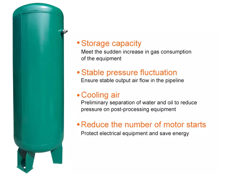 एयर स्टोरेज टैंक एक निश्चित मात्रा में गैस स्टोर कर सकते हैं, और आउटपुट एयर प्रेशर अपेक्षाकृत स्थिर होता है, और साथ ही, वायु पथ को कम किया जा सकता है।बीच का तापमान पानी, धूल और अशुद्धियों का एक हिस्सा हटा देता है।वायु भंडारण टैंक मूल सामग्री को कच्चे माल के रूप में उपयोग करता है, स्वचालित वेल्डिंग तकनीक से संचालित होता है।